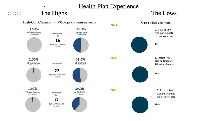 The picture above shows what most of our competitors review in terms of large loss claims (on the left). The exhibit shows both large loss AND zero dollar claimants over a 3 year time period. So many of our competitors fail to highlight and discuss the “Zeros” in the claim report. These are employees and their family members who received ZERO care throughout the year. This client was shocked to learn that over 25% of their covered participants got zero care. Our client felt this was due exclusively to COVID. This is why we showed the 2019 experience as well since this highly male dominant group did not receive care prior to COVID either. When I look for Hero’s within a company, we’re looking for members of the executive or HR/Benefits team who understand that Zero claims are bad. These are the people who say that they are feeling fine and do not need to go to the doctor. They are the Chris’s. Zero’s on your claim report are opportunities to do a better job in finding cancer sooner, flagging pre-diabetes/Mets, preventing a stroke, or helping someone reverse pre-diabetes, learn of their diabetes or avoid an amputation.